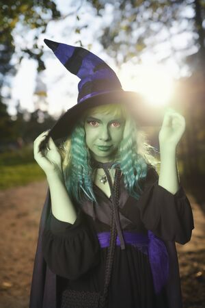 Young girl with green hair and skin suit of witch in forest. Halloween time