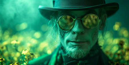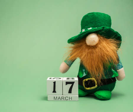 Irish gnome or leprechaun in a green suit on a green background. Composition for St. Patrick's Day