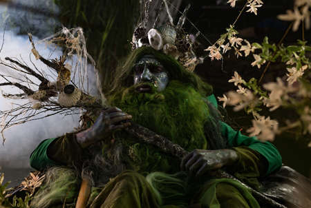 Evil witch on nature dark background, closeup portrait of old lady with terrifying makeup, Halloween background