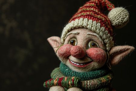 Portrait of Amigurumi crocheted or knitted Christmas Elf stuffed toy on black background