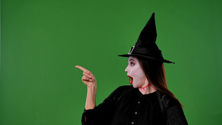 A witch with vampire makeup, in black cloak and hat, points her finger to the side