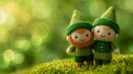 Charming handcrafted elf figures in vibrant green attire rest gently on a plush mossy bed, surrounded by a softly blurred, sunlit woodland scene creating a whimsical