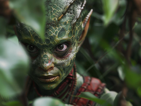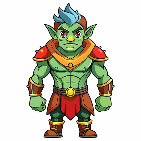 Green-skinned creature with blue hair, gold trim, and red armor stands sternly