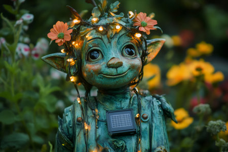 A gnome figurine stands in the center of a blossoming garden, surrounded by colorful flowers and lush greenery, under the bright sunlight