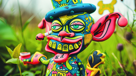 Alien with tendrils and pink flowers in a garden. Extraterrestrial creature among vibrant plants. Concept of alien life, nature, science fiction, botanical design.