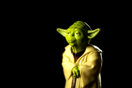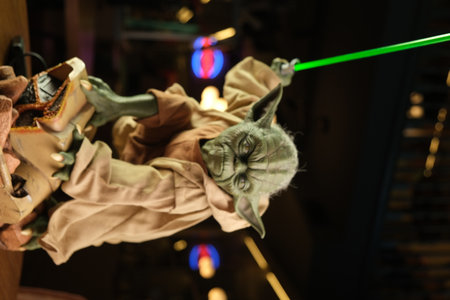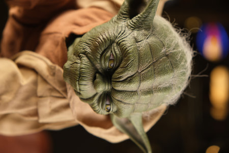 Riga,Latvia- May 16,2021: Master Yoda from Star Wars fictional character figures in children's toy store.Yoda serves as the Grand Master of the Jedi Order and as a high-ranking general of Clone Troopers.