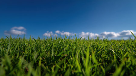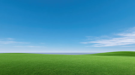 A picturesque view of vibrant green grass under a stunning blue sky creates an inviting atmosphere, perfect for nature-themed projects or backgrounds.