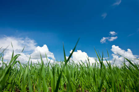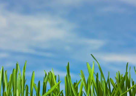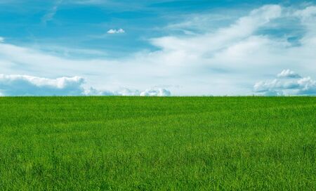 Fresh green grass over blue sky with white clouds, abstract natural background, freshness of spring season