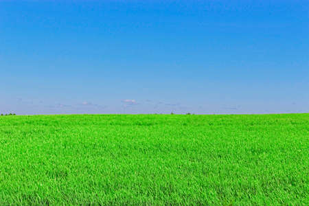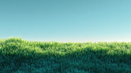 Serene green meadow filled with fresh grass under a clear blue sky, showcasing the beauty of nature in a peaceful outdoor setting. Ideal for seasonal themes.