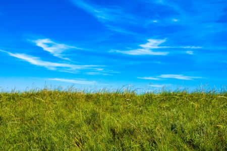 Field of green grass in summer on the horizon with a blue cloudy sky.