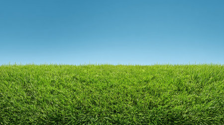 This stunning image captures a vibrant green grass field stretching toward a clear blue sky, creating a peaceful and serene atmosphere perfect for outdoor themes.
