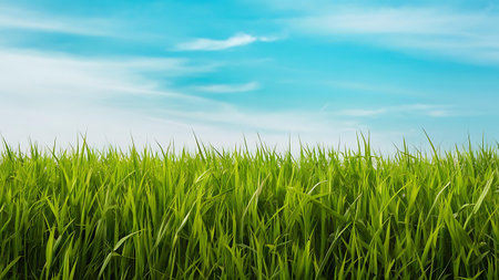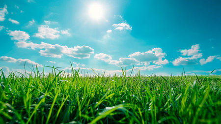 This vibrant image captures a field of lush green grass against a backdrop of a bright blue sky and soft clouds, radiating warmth and freshness in a tranquil setting.
