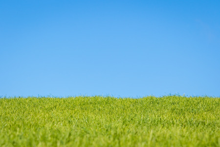 A close up of a green field with a blue sky in the background. The grass is lush and the sky is clear
