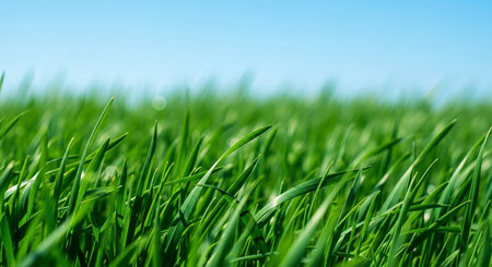 Close-up view of green lawn grass land with blue sky. Spring seasonal concept. AI generated.