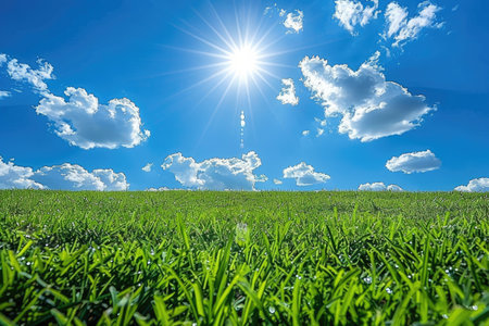 This image features vibrant green grass set against a bright blue sky filled with fluffy white clouds. The sun shines brightly overhead, creating a peaceful and serene outdoor atmosphere, perfect for representing nature or a tranquil landscape.