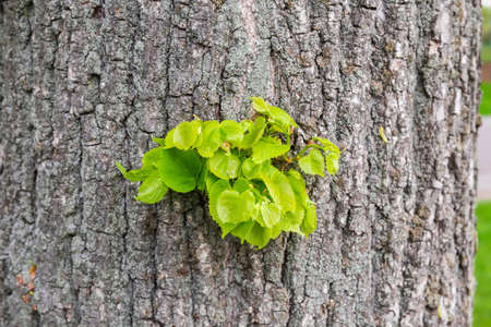 Fragment of the trunk of old linden with young shoots through the bark with fresh spring leaves, close-up in selective focus