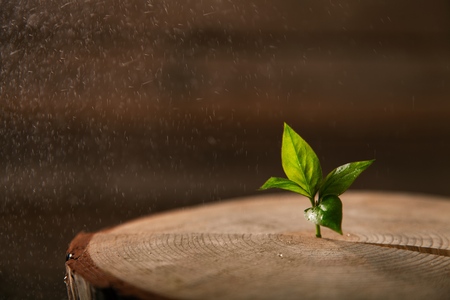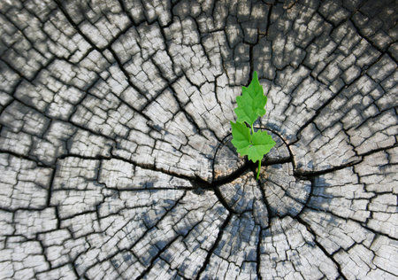 strong seedling growing in the center trunk from a dead tree stump,business concept of emerging leadership success generating new business.