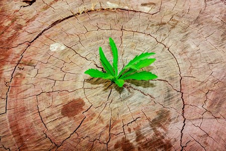 A new life start with the sprout of green leaves on a dead trees stump. Recovery of the Nature