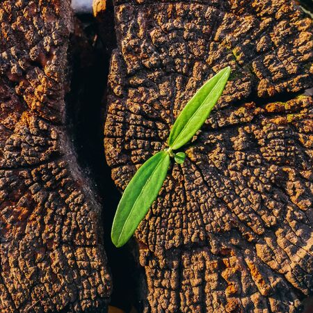 Green tree growing new life leaf on rotten wood stump wall Green leaves of palm tree fresh plant texture in natural tropical garden. Grove greenery wooden plantation ecology system concept.