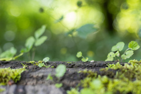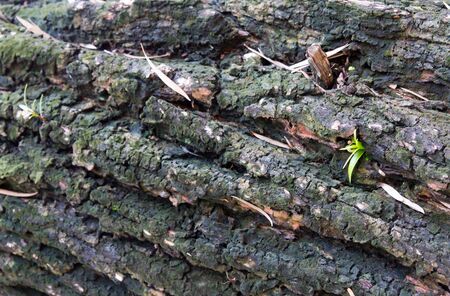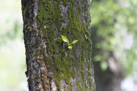 A sprout of wood on the bark of an old tree overgrown with moss. Photo for your design.