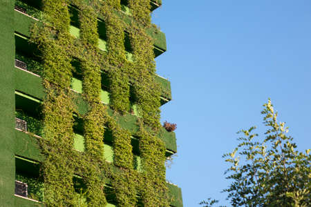 Sustainable green building with plants on facade. Modern environment friendly green urban development background