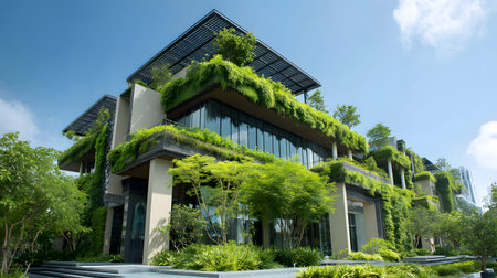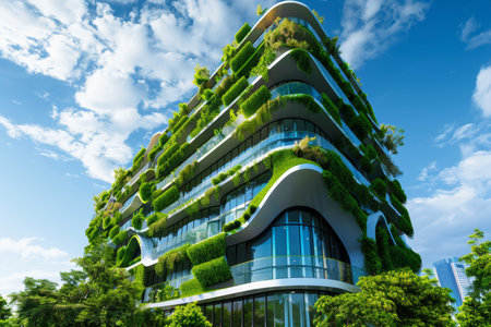 Innovative buildings covered with lush greenery demonstrate eco-friendly urban living in a vibrant city.