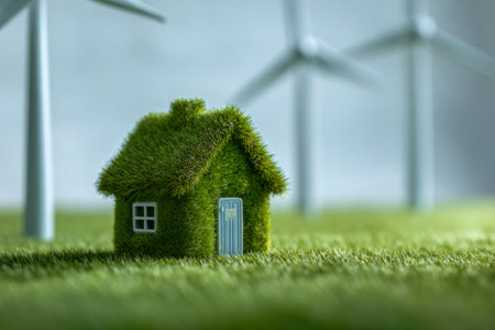 A miniature home nestled in lush greenery, set against towering wind turbines beneath an overcast sky, embodying sustainable and harmonious rural life.