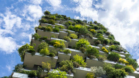 Residential tower, an example of modern architecture with various plants and tree-covered balconies. Sustainability and tree skyscraper concept.