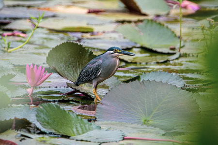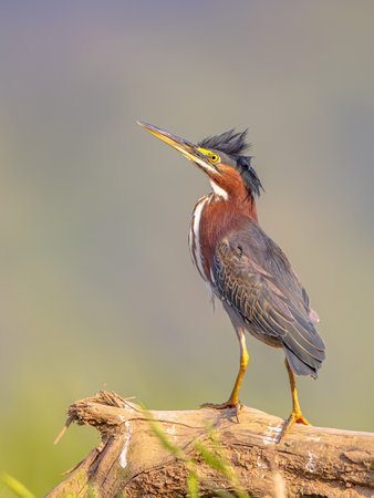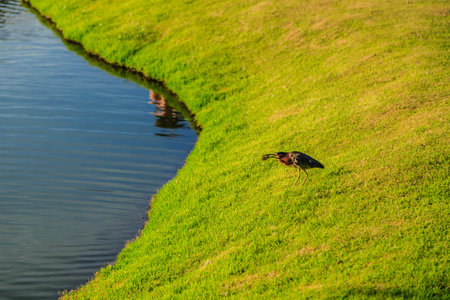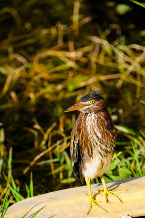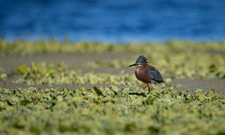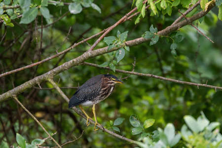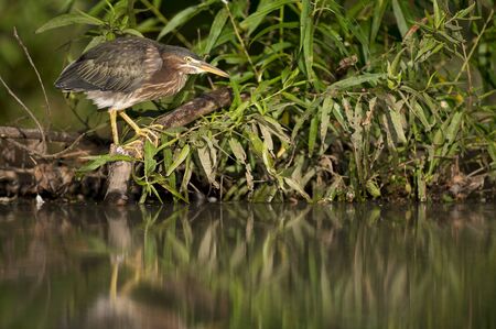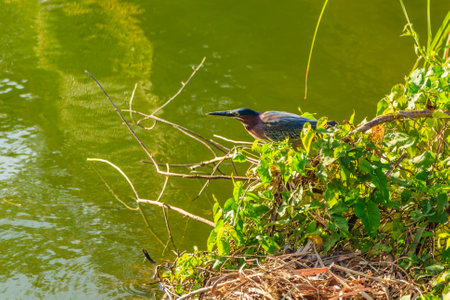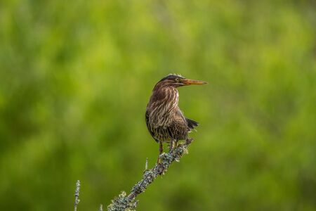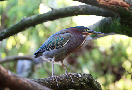 Green heron (Butorides virescens) is a small heron of North and Central America. This bittern like bird is a migrant species. Wildlife scene of nature in central america.