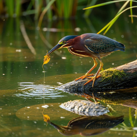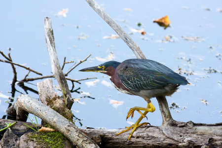 Green Heron (Butorides virescens) walking on a log while hunting in Maryland during the Summer