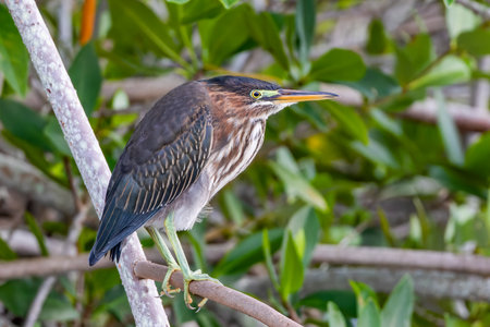 A juvenile green heron on a branch at the wetland with lush greenery in the background in early summer on a sunny morning