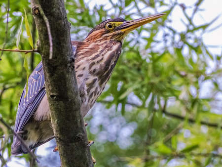 A green heron, Butorides virescens, perched on a tree branch at Harbor Island, Grand Haven, Michigan