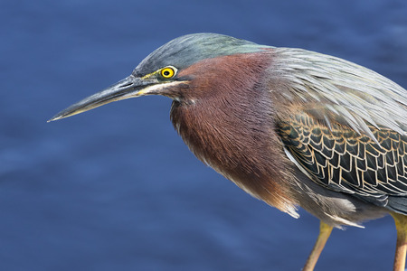 A unique headshot of a Striated Heron, Butorides striata, isolated against the blue sky.