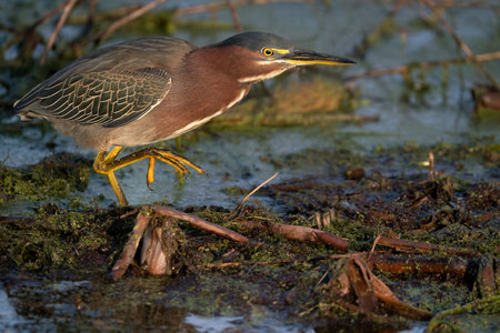 Green Heron (Butorides virescens) walking at the edge of the water in the Florida Everglades