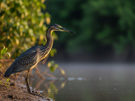 Striated Heron, Butorides striata, in the early morning light in a lake with his reflection and light reflecting off the water.