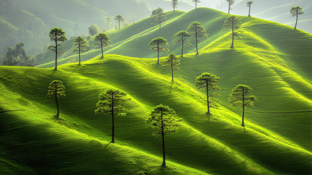 This stunning landscape features vibrant green hills adorned with tall trees, bathed in soft sunlight, creating a serene and peaceful atmosphere perfect for nature lovers.