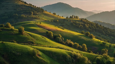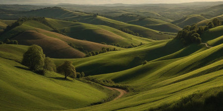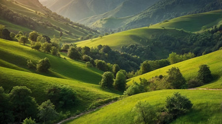 This captivating image showcases rolling green hills under gentle sunlight, creating a peaceful and tranquil atmosphere that invites exploration and appreciation of nature.
