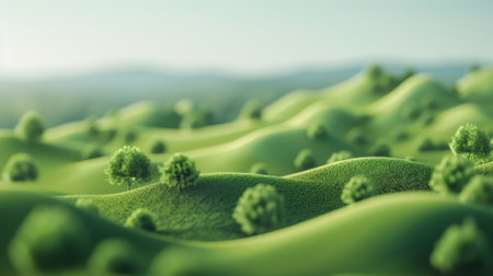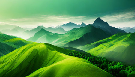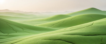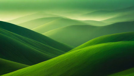 Abstract modern hilly landscape in the morning mist. Green colors. Wallpaper Landscape with rolling hills