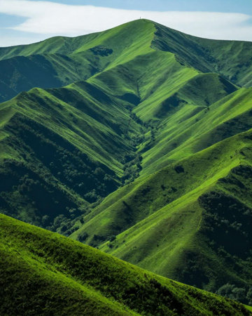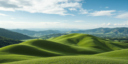 Traverse rolling hills and valleys with greenery as far as the eye can see. ai generative