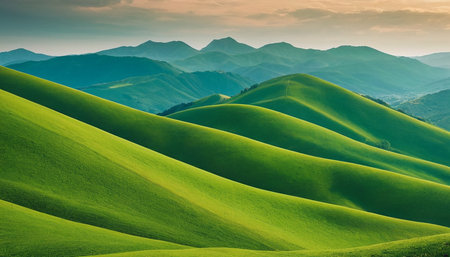 Rolling green hills stretch across the landscape, with gentle mountains rising in the distance under soft morning light, showing natures serenity.