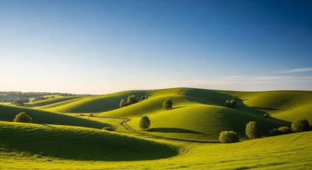 Expansive, rolling green hills stretch across the landscape under a clear, bright blue sky. Scattered trees dot the vibrant green slopes, and a winding dirt path meanders through the undulating terrain. The scene conveys a sense of peace, openness, and natural beauty, characteristic of a serene countryside. The sunlight highlights the textures of the grass and the gentle curves of the hills.