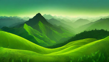 This abstract green landscape wallpaper illustration captures the beauty of nature with soft rolling hills and towering mountains in a clean, minimalist design. Ideal for creative use and