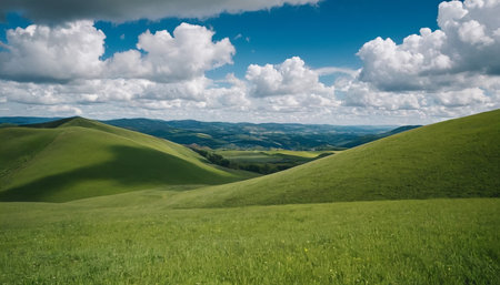 Explore the serene beauty of lush green rolling hills under a vibrant blue sky adorned with fluffy clouds. This idyllic landscape invites relaxation and admiration.