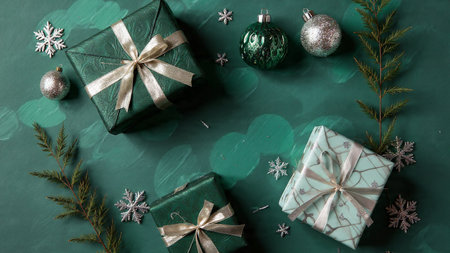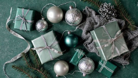 A smooth matte green surface bordered by premium wrapped presents and metallic silver ornaments.