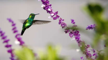 Western emerald (Chlorostilbon melanorhynchus) hummingbird in flight, feeding from purple sage in a garden in Cotacachi, Ecuador