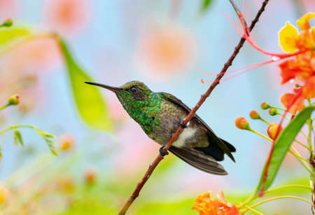 A juvenile Copper-rumped hummingbird defending his perch in a Pride of Barbados tree. Birds in a garden. Wildlife in nature. Hummingbird with colorful background.