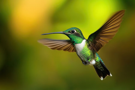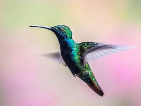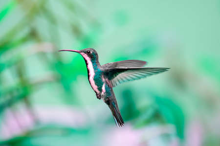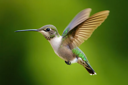 Female Black-throated Mango hummingbird, anthracothorax nigricollis, with green tint and a green background caught in flight, in motion.