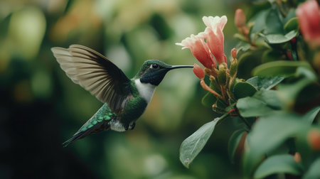 Hummingbird flying next to flowers in the rainforest of Costa Rica