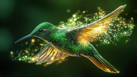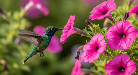 Vibrant hummingbird sips nectar from bright pink petunia flowers