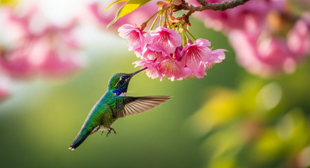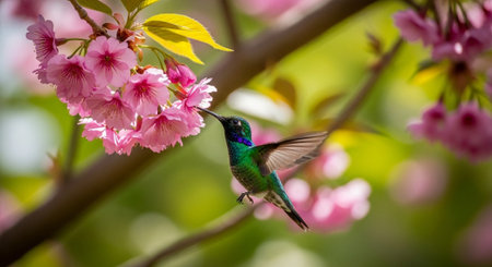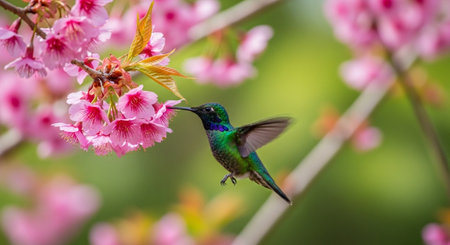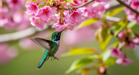 Vibrant hummingbird feeding on cherry blossom flower in spring